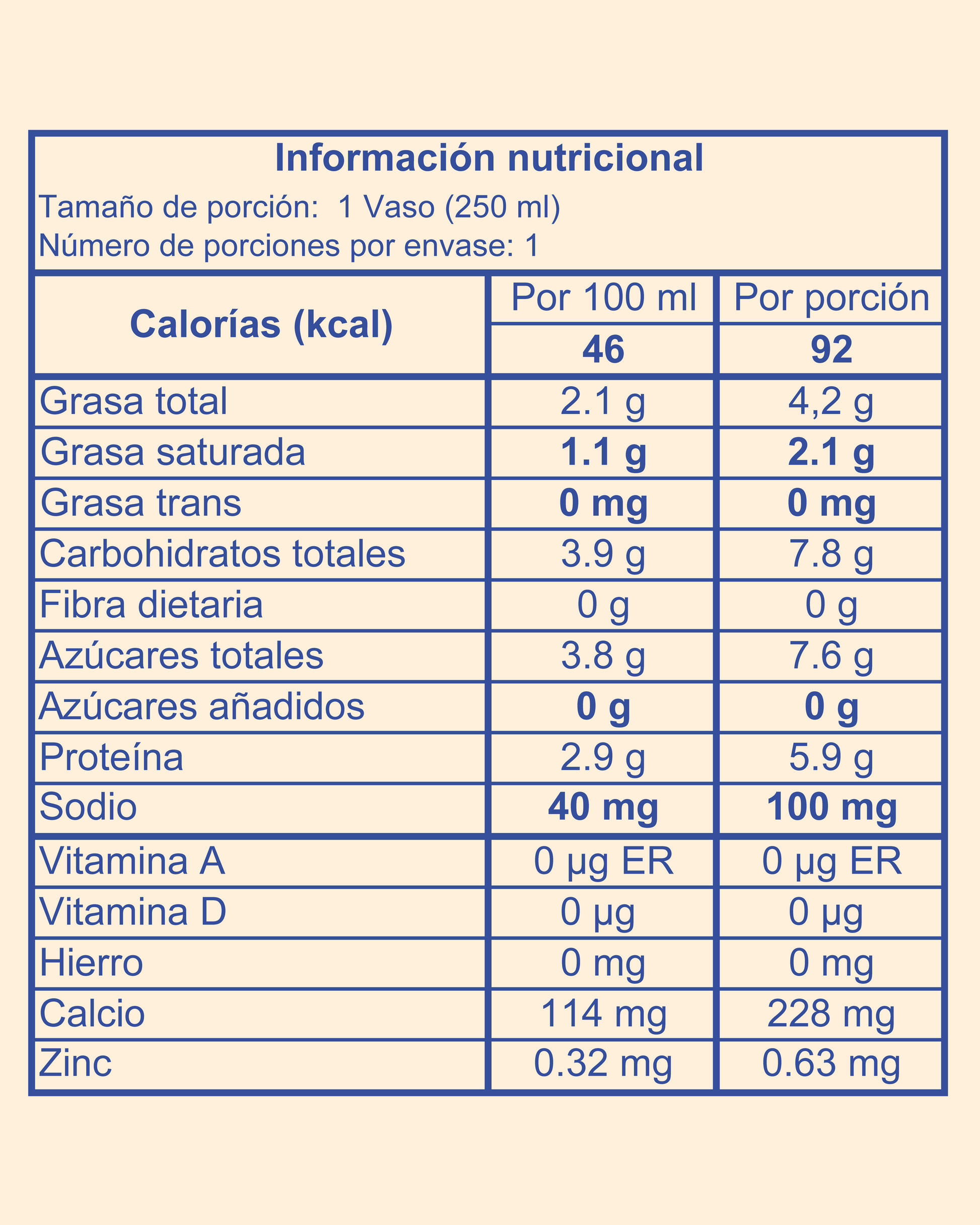 Ingredientes: Leche higienizada semidescremada, Cultivos lácticos (Lactococcus lactis ssp. lactis, Lactococcus lactis ssp. cremori, Lactococcus lactis ssp. lactis biovar diacetylactis, Lactobacillus brevis, Leuconostoc mesenteroides, la levadura kluiveromyces marxianus, Saccharomyces bayanus).